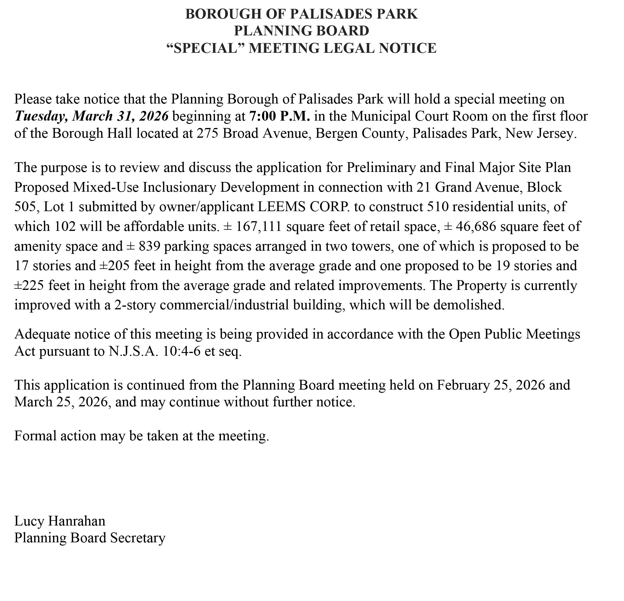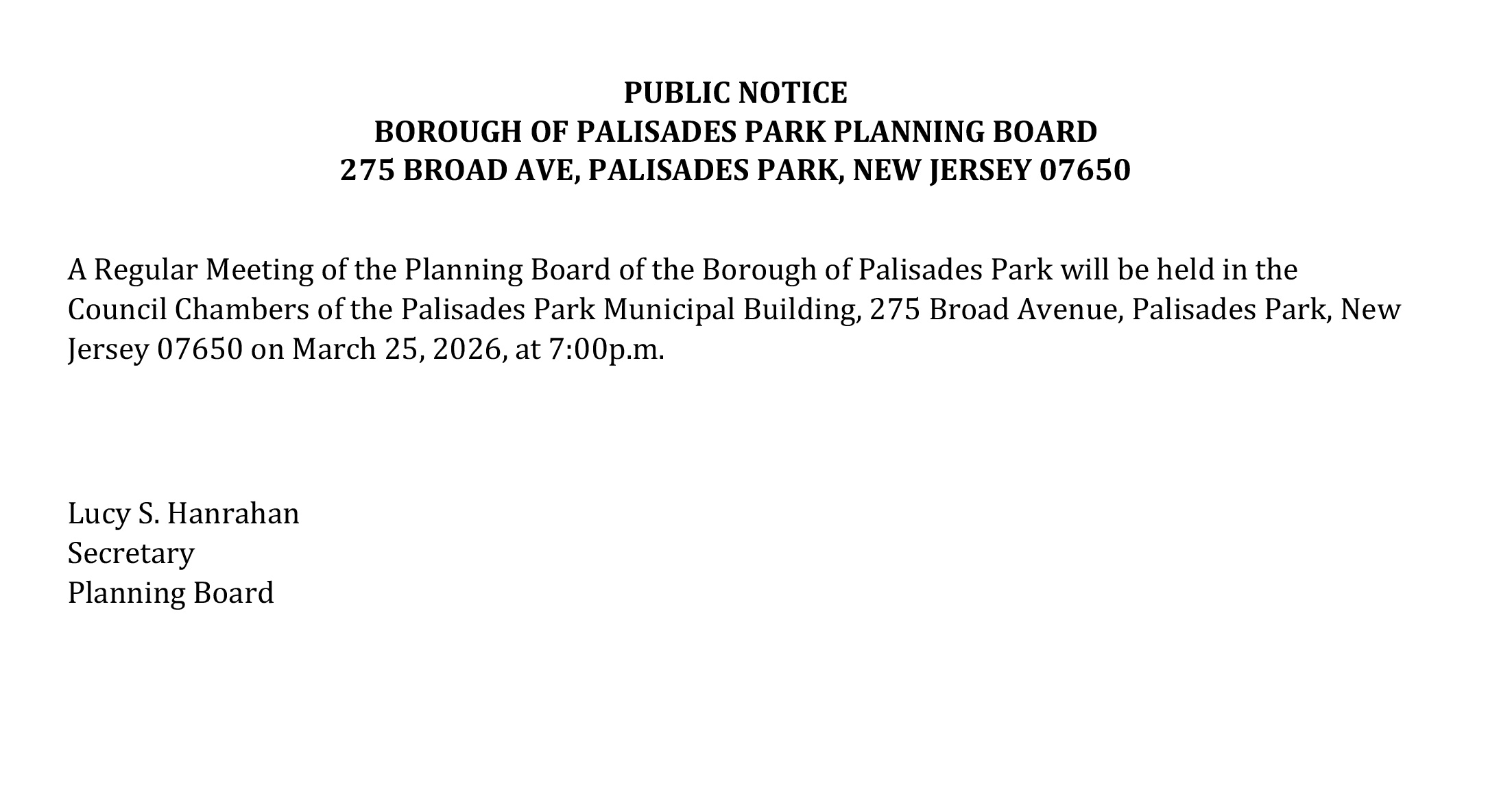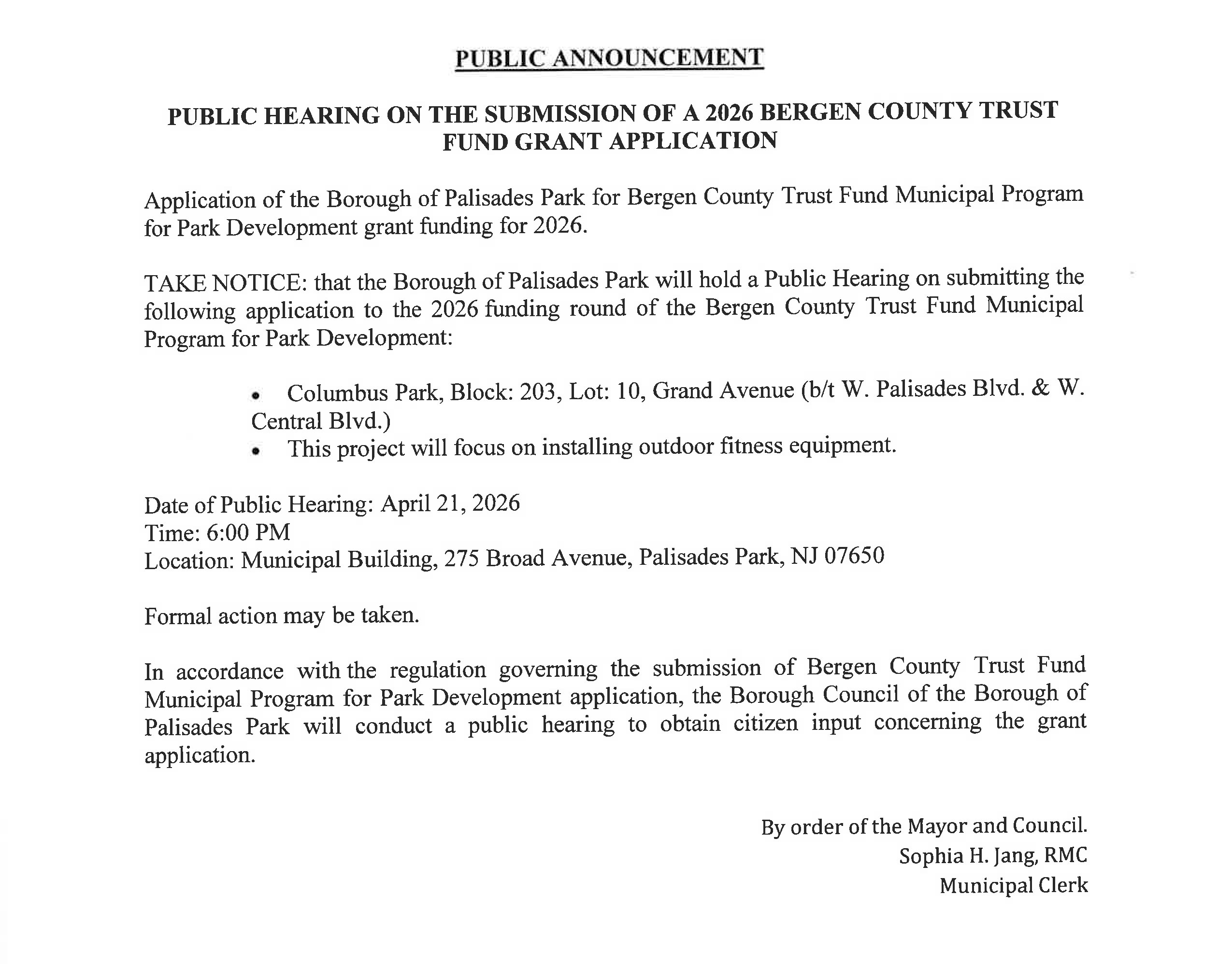 | Apr 1, 2026 | Notice | Public Announcement | Borough of Palisades Park | View |