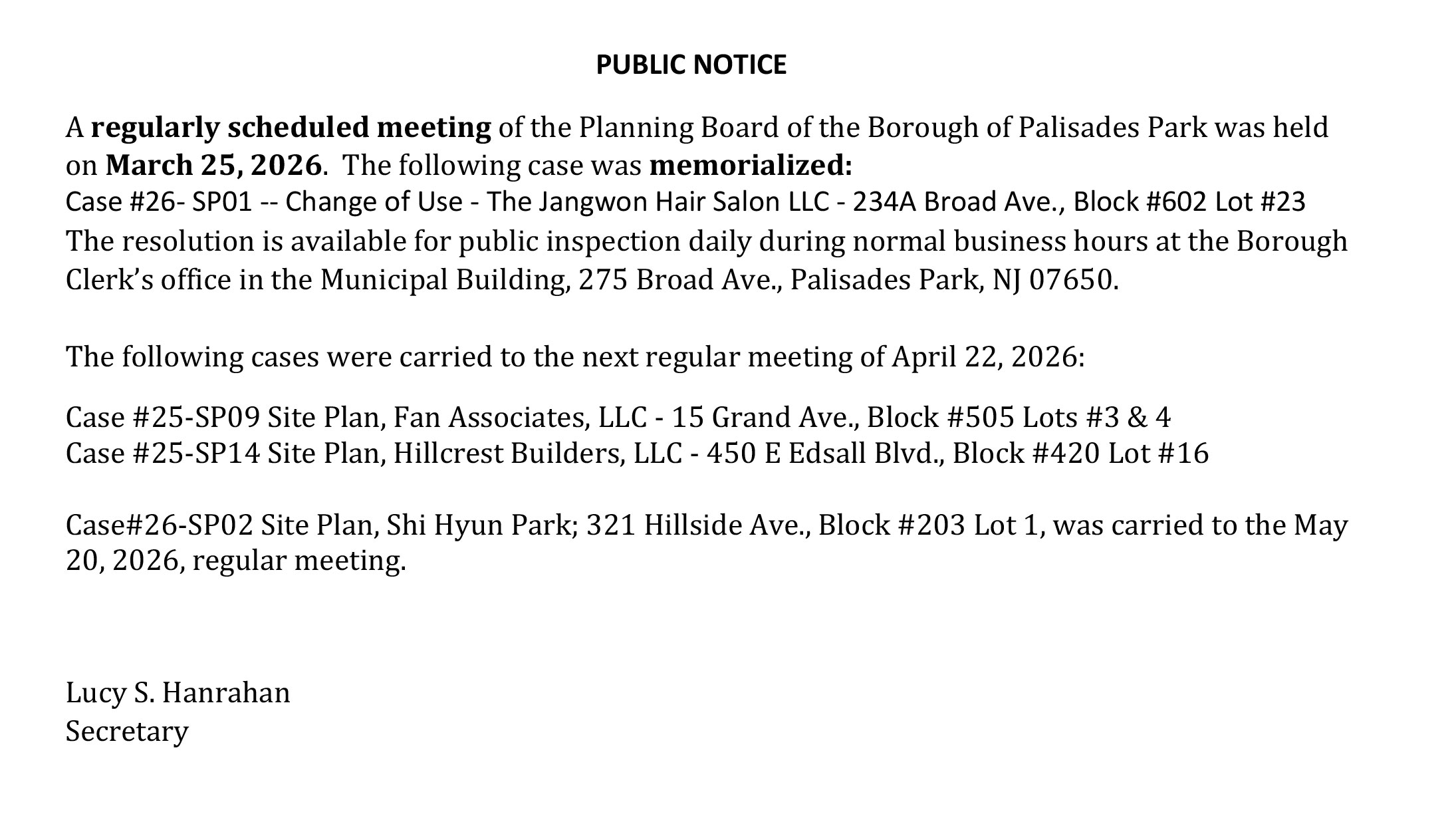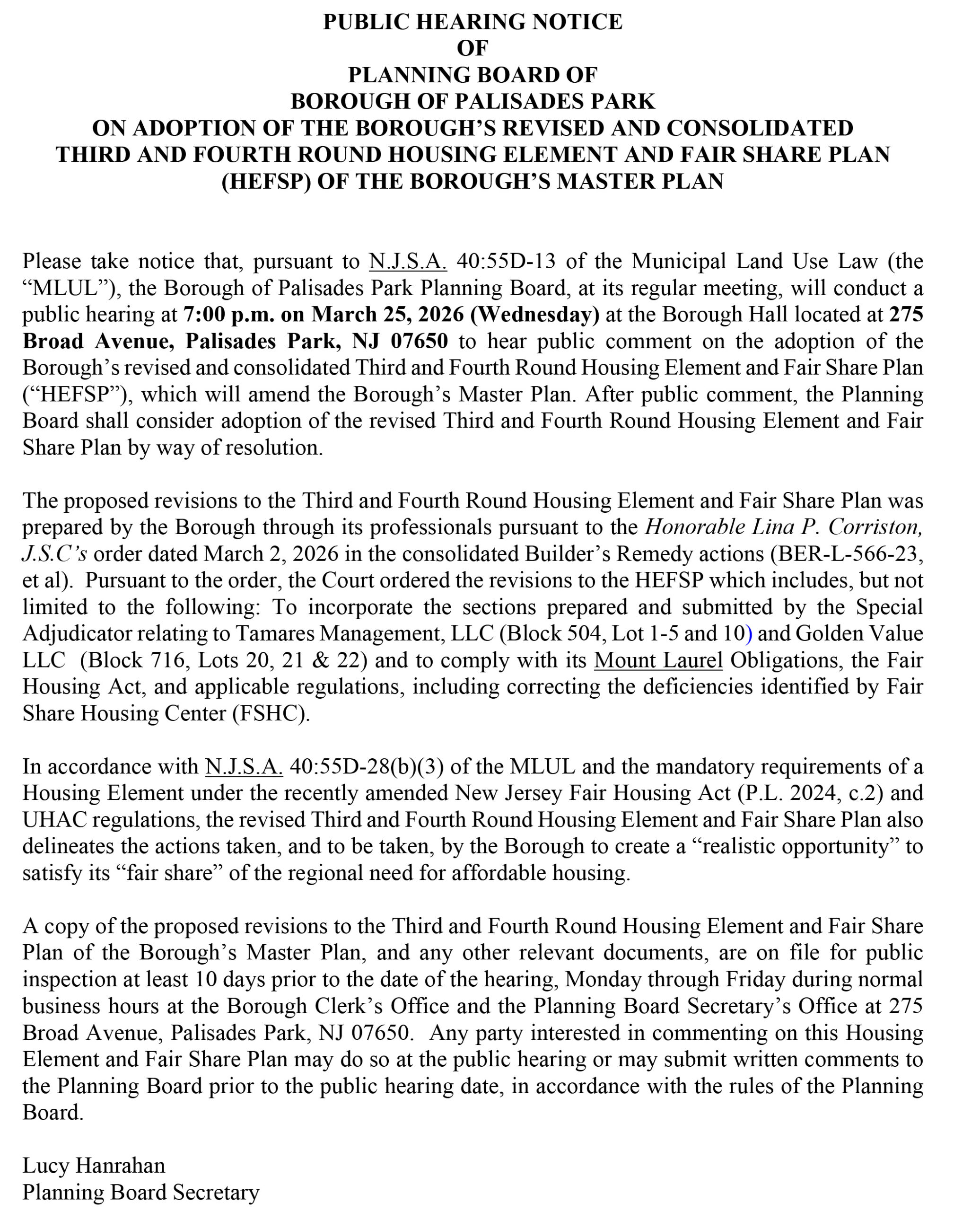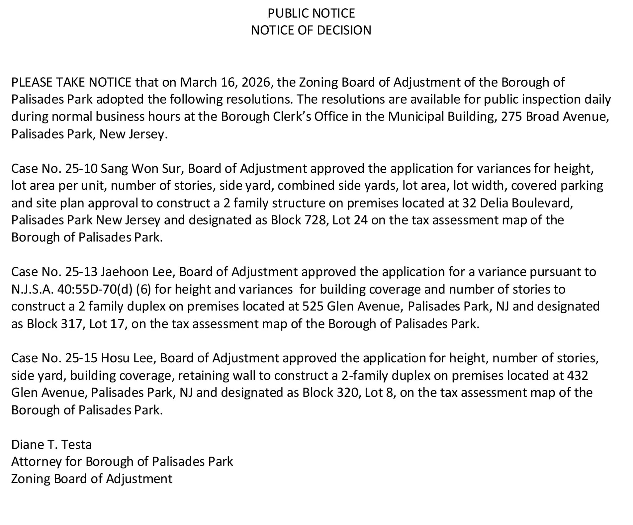 | Apr 1, 2026 | Notice | Public Announcement | Borough of Palisades Park | View |